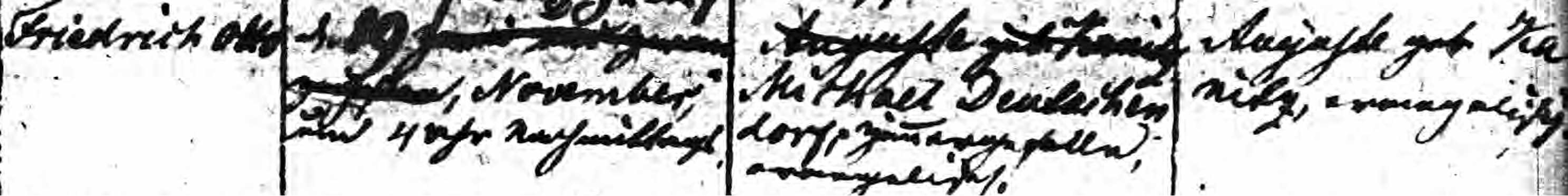 The un-married Foreman from Rosenberg, Friedrich Otto Deutschendorf, son of the Master Carpenter Michael Deutschendorf and the virgin Florentine Scharnitzki, a daughter of the vassal Albert Scharnitzki in Deutch Eylau, were married on November 11.
